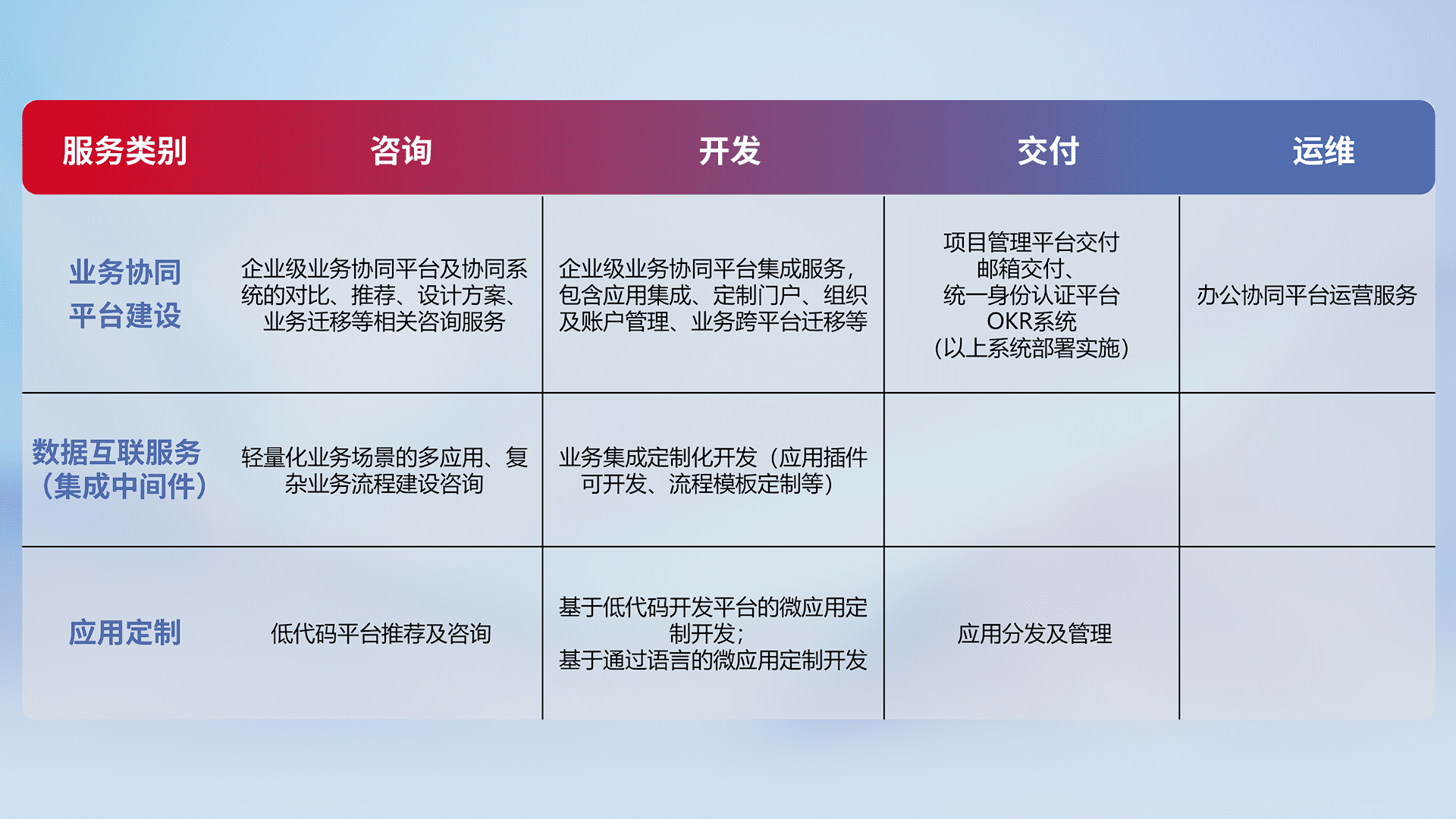 针对钉钉、、、、企微、、、、IDaas等平台级产品提供产品的规划、、、方案、、、、交付、、、定制化开发等服务,,实现如统一协同办公、、、智能客户服务、、、、混合会议管理、、、、智能数据查询、、、、等业务场景,,,实现数字化转型。。。。