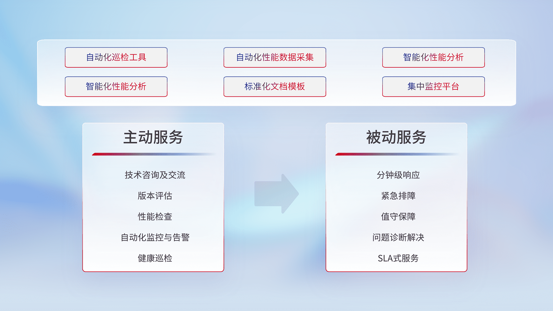 智能化工具和标准化文档,,保障服务质量,,提供主动服务(包含技术咨询、、、、版本评估、、、性能检查、、、自动化监控与告警、、、、健康巡检)和被动服务包含(分钟级响应、、、紧急排障、、值守保障、、、问题诊断解决、、、、SLA服务)。。。